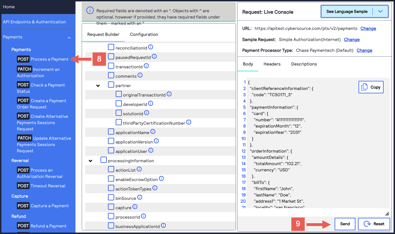 - Go to the Developer Center's API Reference and navigate toPayments >.POSTProcess a Payment