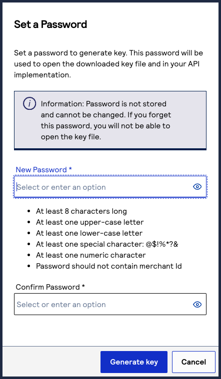 - Create a password for the certificate by entering one into theNew PasswordandConfirm Passwordfields. ClickGenerate key.