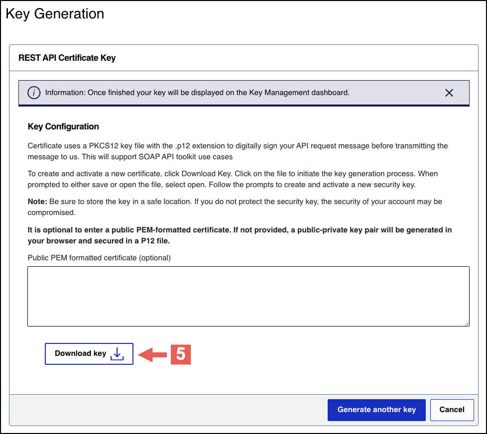 After creating your key certificate, you must verify that it can successfully process API requests. This task explains how to test and validate your private key in the Developer Center and the