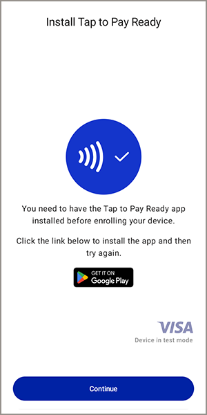 - When the Tap to Pay Ready app is not installed on your Android device, you are prompted to install the app. Tap the Google Play icon to install the app. When installation is complete, return to the Acceptance Devices app and tapContinue.