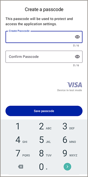 - On the Create a Passcode screen, enter a unique passcode. The passcode must consist of six digits. Confirm the passcode by entering it a second time, then tapSave Passcode. You will use this passcode to access the app, so choose a code that you will remember.The app does not include an option to reset the passcode. If you forget the code, you must reinstall the Acceptance Devices app and complete the set-up process again.