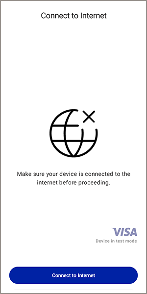 - When your device is connected to the internet, the Internet Connected screen appears. TapContinue. You are prompted to activate your device in the Acceptance Devices app. See Activating an Android Device in the Acceptance Devices App.